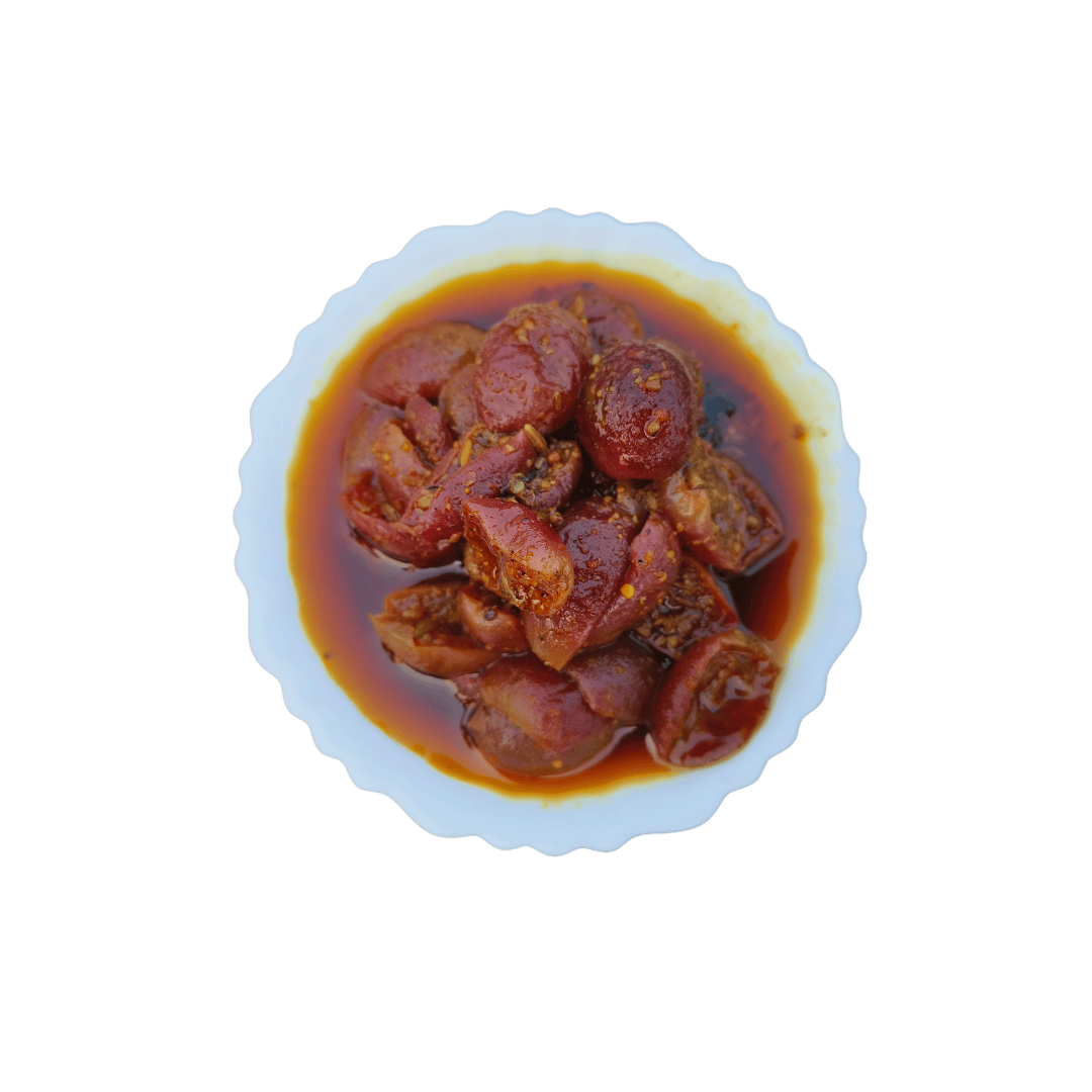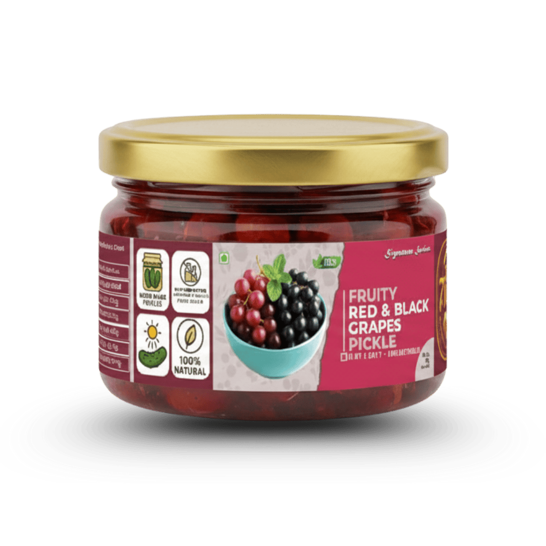 Sweet red & black grapes meet mint’s freshness in a pickle that’s juicy, surprising, and soulful. It’s a celebration of contrasts – bold yet tender, playful yet soothing. A spoonful feels like a festive hug, bursting with joy and gentle warmth.